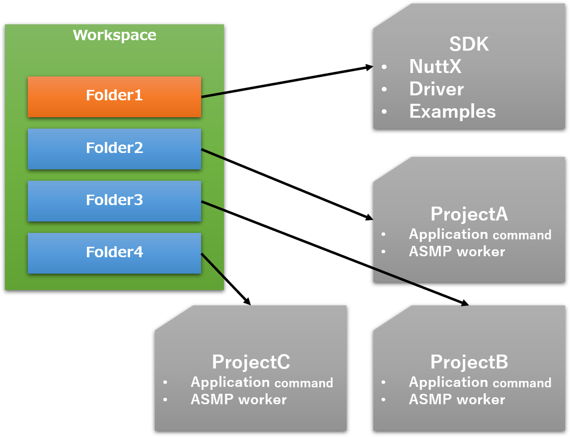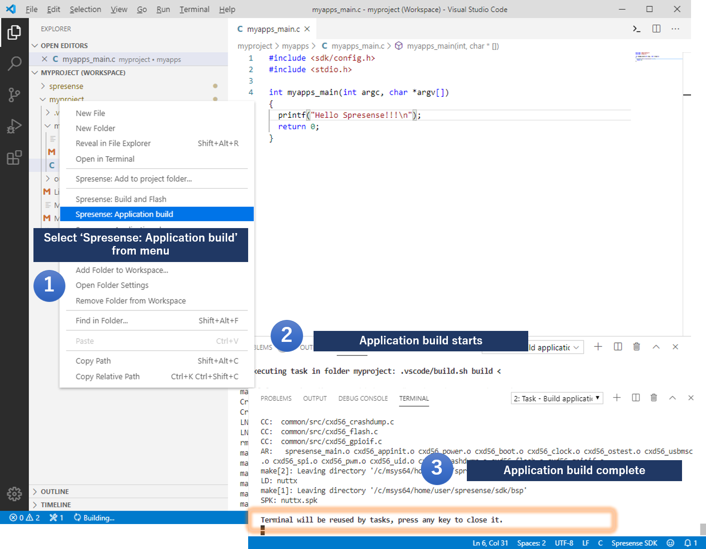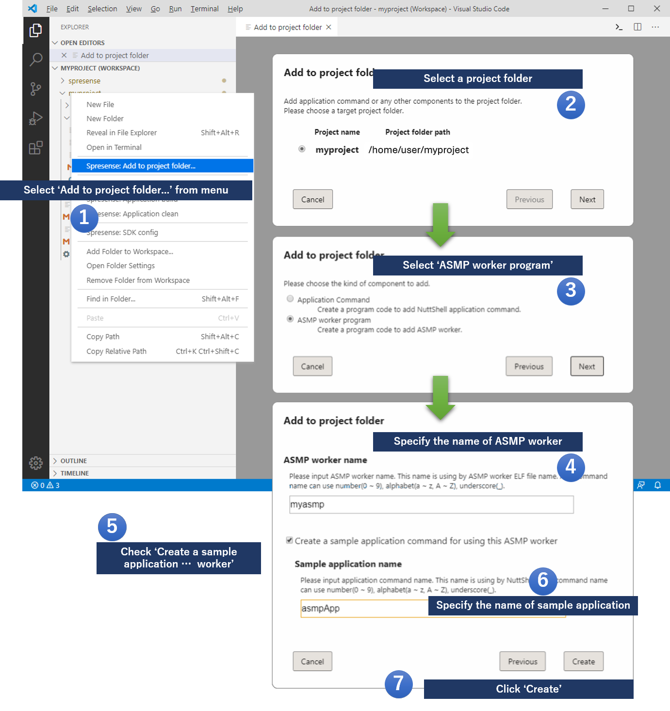 Using the above functions, here is an example of adding a simple sample application myapps to a project called myproject, and explains how to run the application by Spresense.