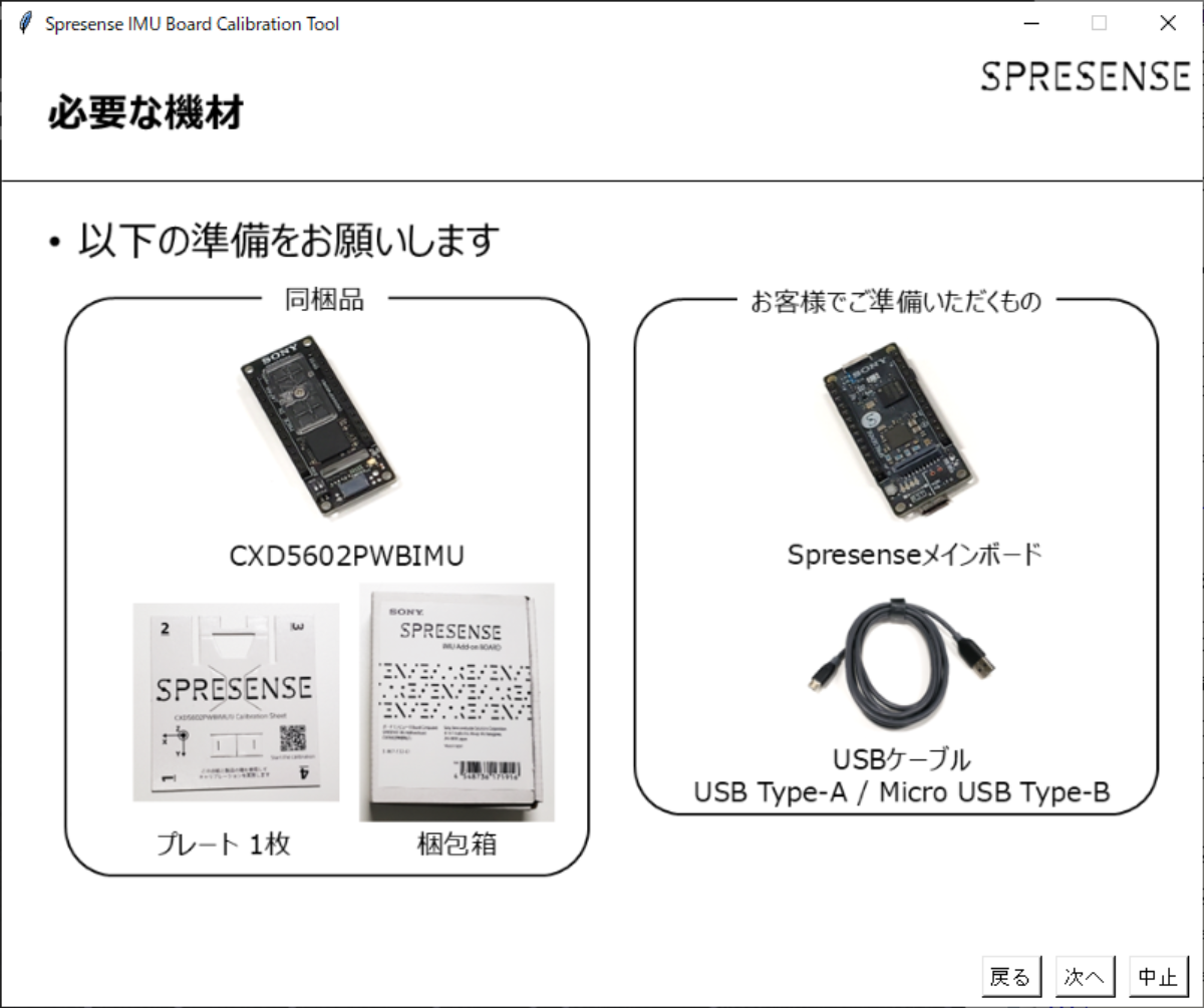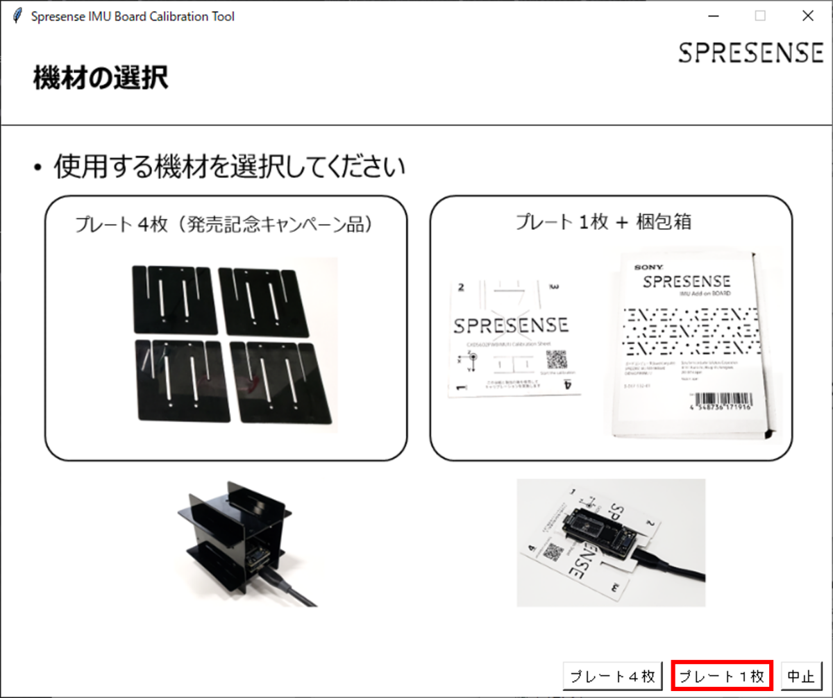 本ページのマニュアルは Spresense IMU アドオンボード キャリブレーションツール「プレート 1枚」という機材向けとなっております。「プレート 4枚」をご利用のお客様は、該当ページをご参考ください。