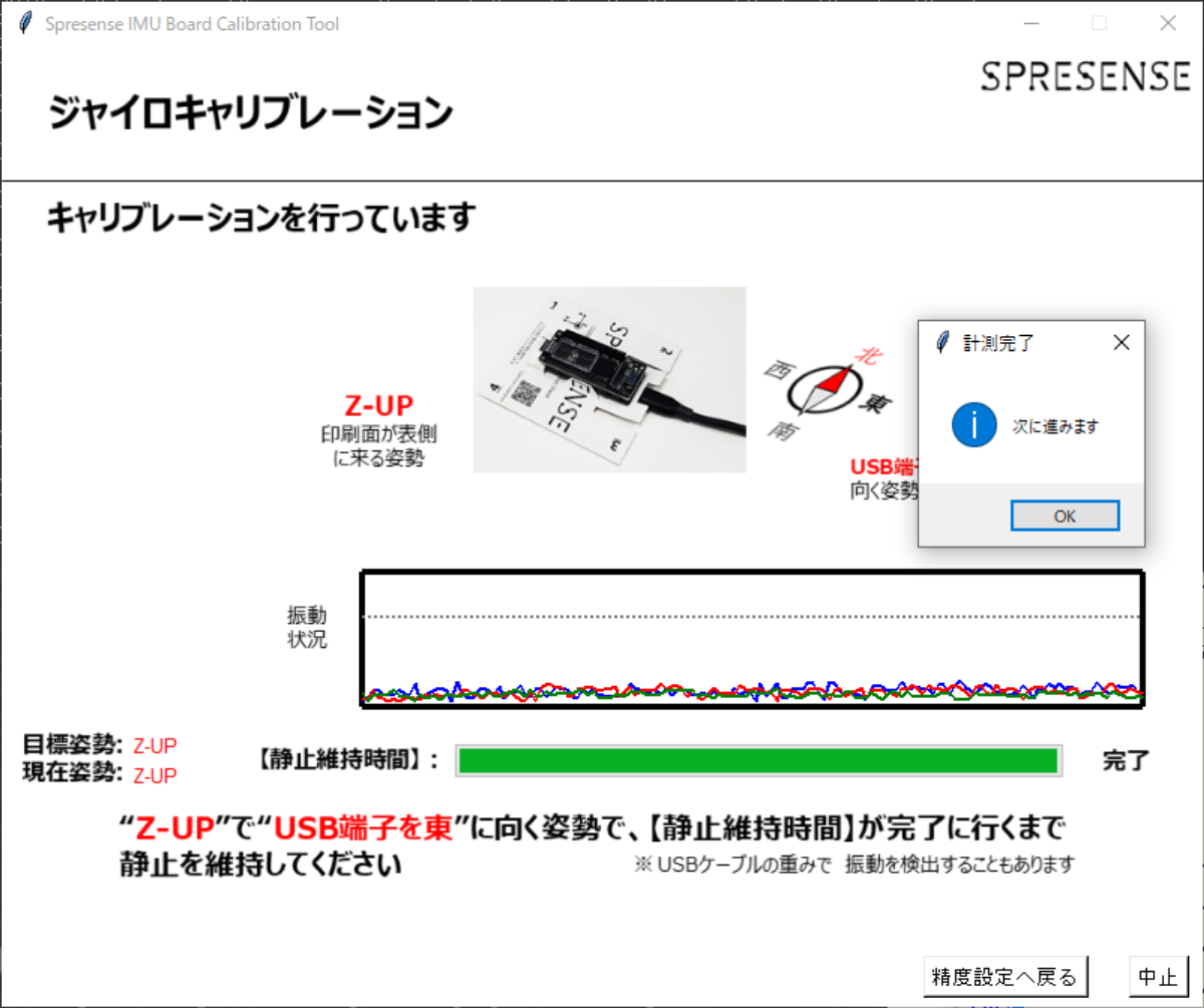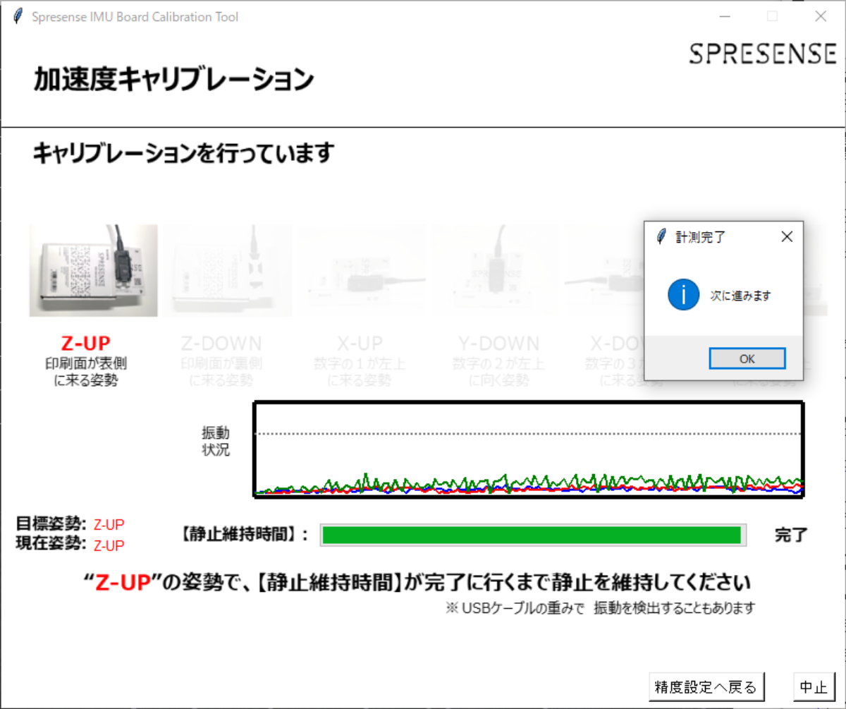 現在の姿勢での加速度キャリブレーションデータの取得が完了したら、「OK」ボタンを押してください。