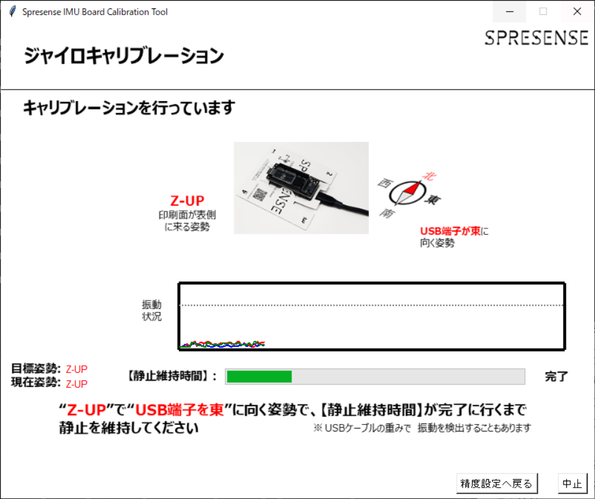 目標姿勢Z-UPを例に加速度キャリブレーションデータの取得の方法を説明します。同様の方法で全ての姿勢(合計6姿勢)で行ってください。