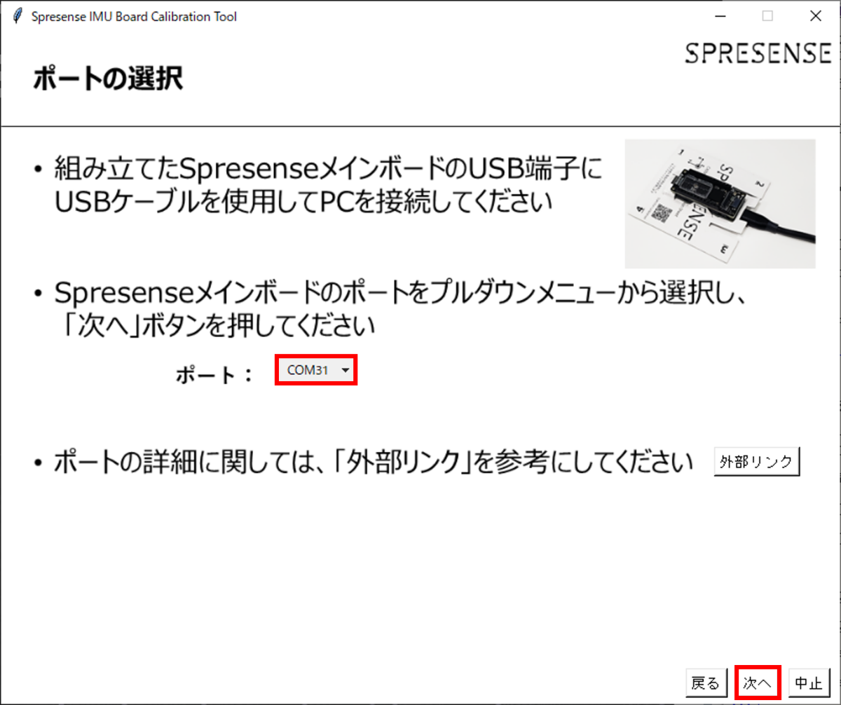 Spresenseメインボードのポートをプルダウンメニューから選択して、「次へ」ボタンを押してください。