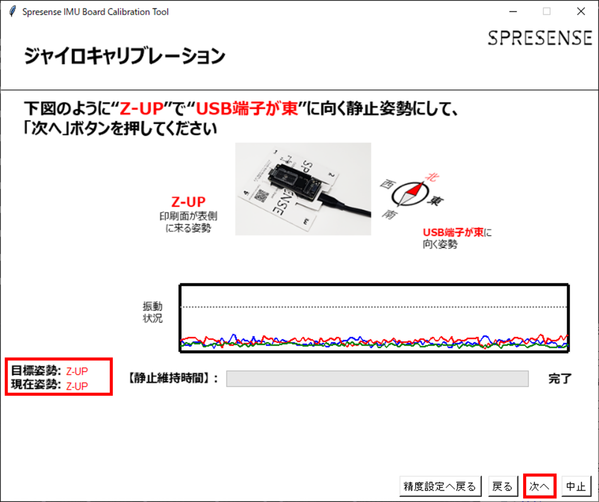 現在姿勢を目標姿勢に合わせて、かつUSB端子を東に向けて、「次へ」ボタンを押してください。