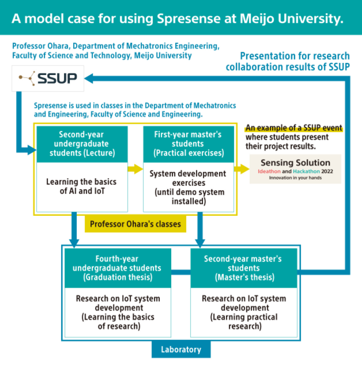 From undergraduate to master's programs, students conduct lectures and seminars using Spresense and participate in "Ideathon and Hackathon of Sensing Solution", where students present their project results. These lead to graduation theses, master's theses, and SSUP research collaborations programs.